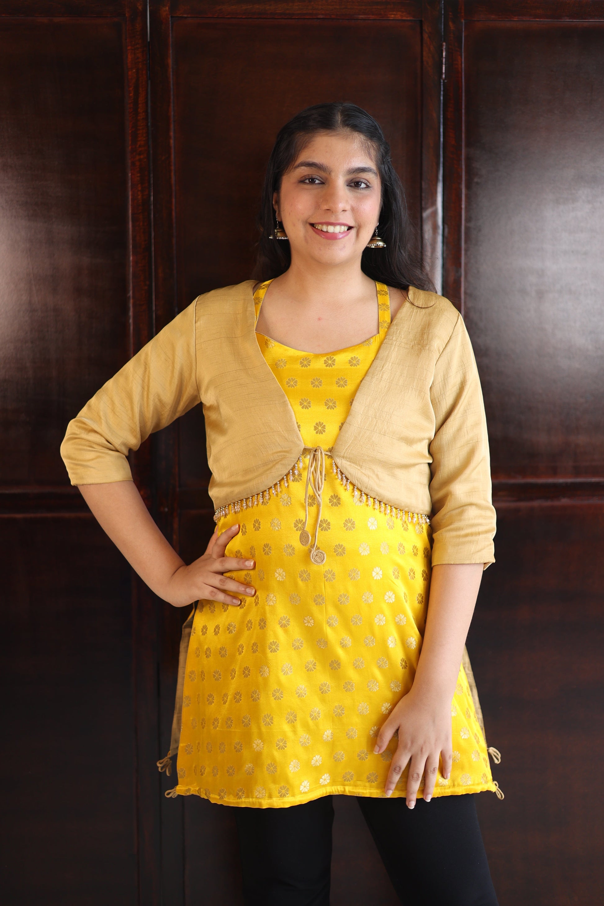 The Mehfil Jacket is a reversible cropped tie-up jacket made to elevate your festive looks. One side features a rich brocade, the other a sleek plain silk — two moods, one design. Perfect to pair with the Mehfil Kurti or mix and match with any outfit for that effortless desi-core baddie vibe.
