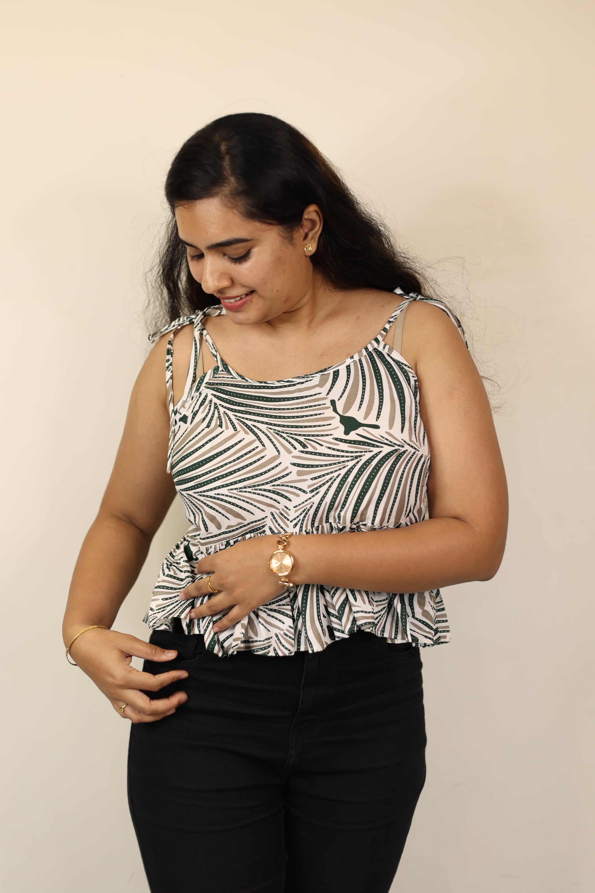 Two necklines, double the fun! The Double Trouble Top is a cute peplum-style top with tie-up straps and prints inspired by nature. Simply flip it for a round neck or V-neck look — perfect for switching up your vibe with a tiny twist!