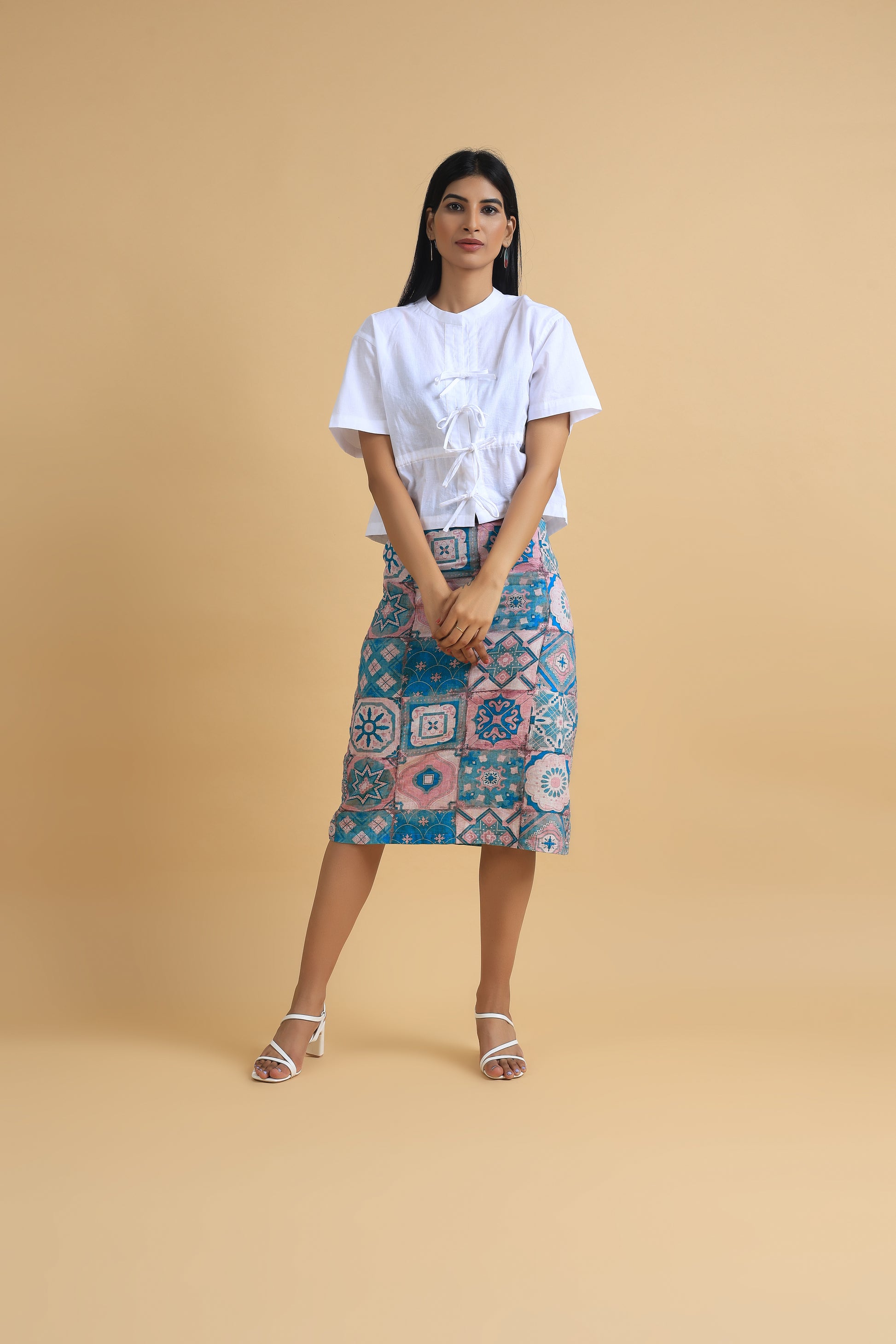 Our signature length-adjustable skirt in a bright cotton print, goes from straight to asymmetrical to gathered mini in seconds. Perfect for the office, parties, or your next getaway